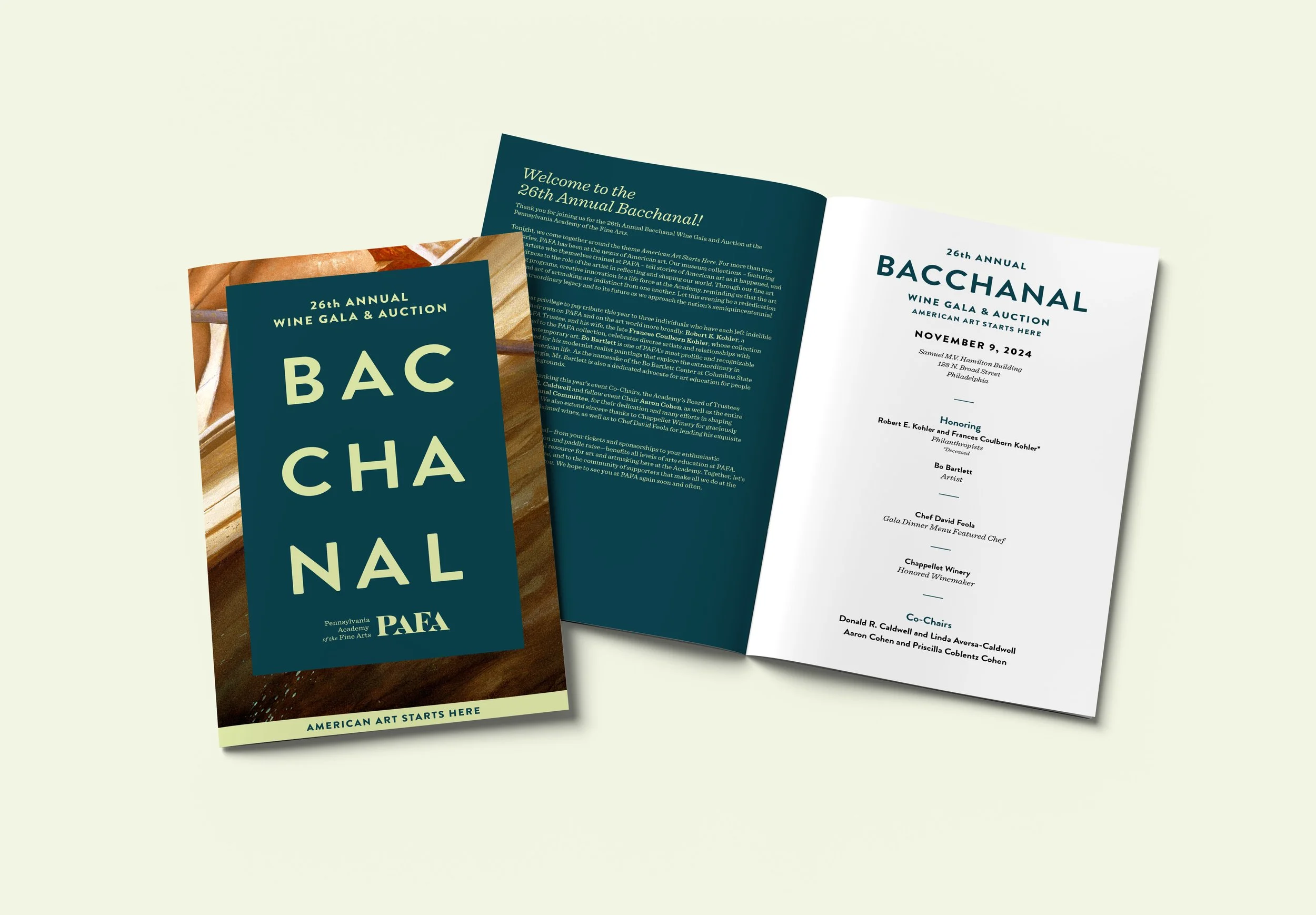 Event branding, with print and digital collateral, for PAFA’s Annual Bacchanal Wine Gala and Auction. Includes 2023 and 2024 events.